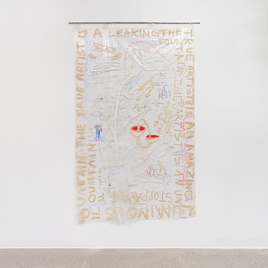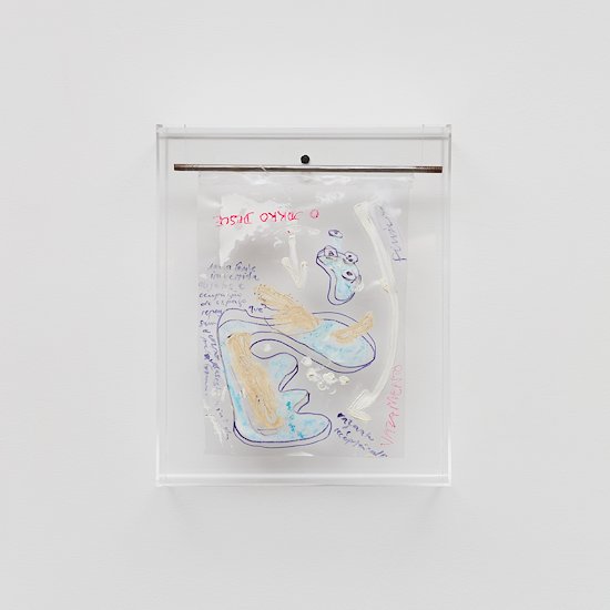 Oil stick, crayon, pen, acrylic, and metal bar hanger on plastic.