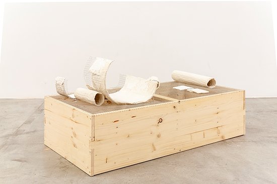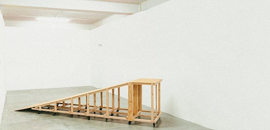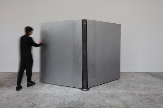 Wood and metal structure that will oxidate accumulating weather and touch prints. The door size structure is divided in two parts and rotates in all directions, reorganizing the space's expography.