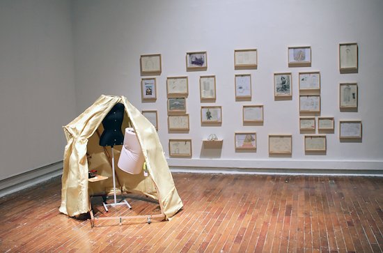 Garmet-house, sewing mannequin, bowls tagged as basic supplies, chamber-pot, mattress, fake plant, drawings and a model on reduced scale.